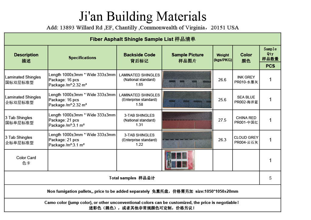 Fiber Asphalt Shingle Sample List